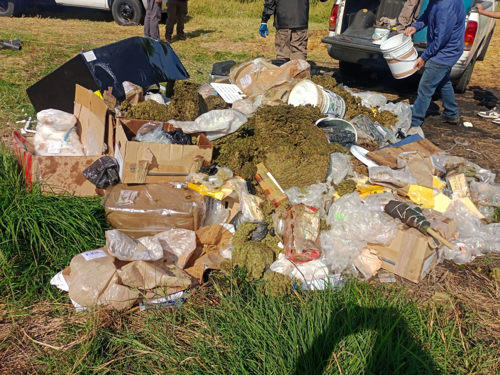 Además, 13 litros 466 mililitros de etanol, 77 mililitros de metanfetamina, mil 493 unidades de psicotrópicos (clobenzorex, diazepam, clonazepam, pseudoefedrina) y 385 piezas de indumentaria policial y objetos del delito (mantas, inhibidores de señal, pantalones, camisolas, teléfonos, chalecos, bidones, pierneras, mochilas, motosierras y ponchallantas).